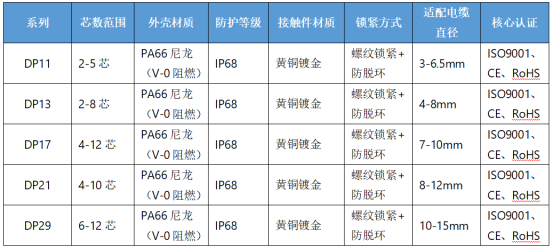 动力传输(如户外储能大电流):选6-12芯(如DP29系列12芯),满足多回路电源连接;