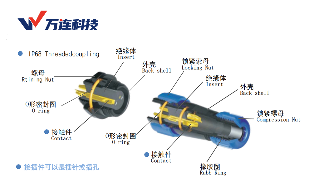 随着户外设备的发展,企业对IP68的要求越来越高,行业迎来了第一次技术升级,也就是三重密封的结构。万连的IP68连接器就采用了这个结构,端子的密封、壳体的端面密封、螺纹的径向密封,三个密封层形成了完整的防护屏障,即使其中一个密封层出现了问题,另外两个也能阻挡水的侵入。同时密封件用了氟橡胶的材质,能在-40℃到125℃的宽温域下保持弹性,不会因为温度的变化出现收缩或者膨胀,这种方案能实现10米的水深长期浸泡,不会渗漏,完美适配户外的长期浸泡场景。