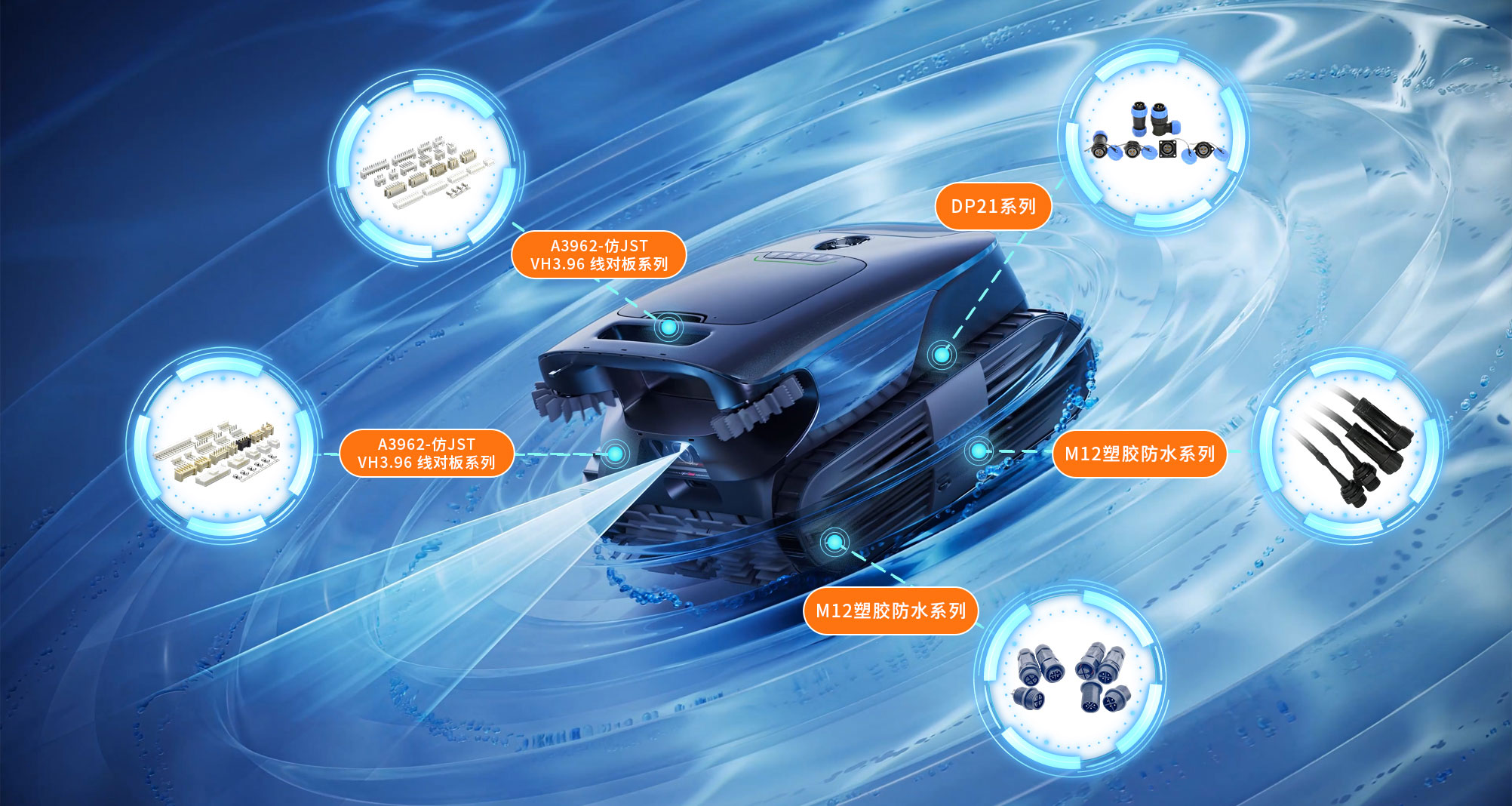 针对水池清洁机器人水下作业进水短路、部件腐蚀、振动松脱及太阳能线束适配难等问题,我们有强大工厂实力与专业定制团队,提供全维度可靠连接解决方案,精准破解客户核心顾虑。 针对智能水池清洁机器人,我们定制多系列主板太阳能线束以攻克适配难题,搭配IP68防水连接器(优质工程塑胶成型,防腐耐蚀、连接稳固抗振),筑牢导电安全防线,根除恶劣环境运行隐患;针对客户缺产品、缺方案的痛点,以多样化产品体系按需优化。 万连科技原厂直供,凭借稳定的产品性能与规模化交付能力保障快速交付,更辅以完善的售后体系,全维度助力客户提升产品可靠性与市场竞争力。