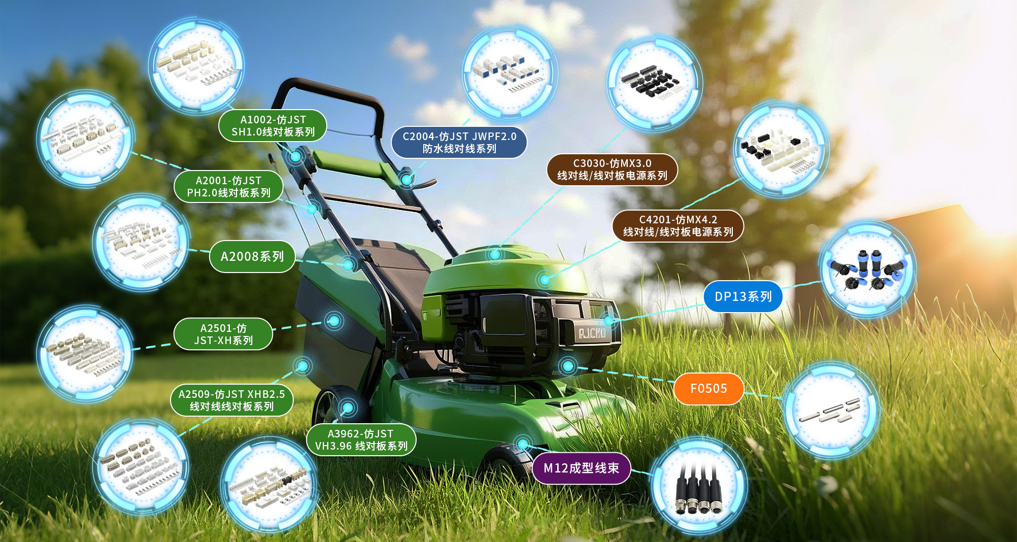 常见刀片电机(转速3000-4500RPM)、刀片高度调节机构等,连接器应用需关注防草屑堵塞、高扭矩适配,支持过载保护信号传输方面。
